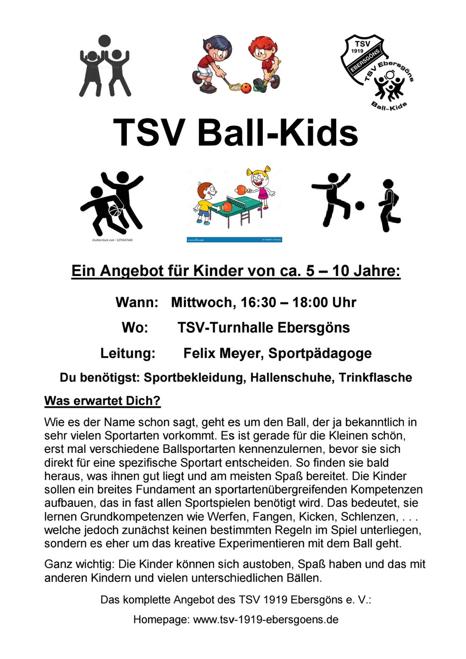 Mit der Ball-Kids-Gruppe bietet der TSV allen Kindern von ca. 5-10 Jahren ein umfassendes und spaßiges Sportangebot mit dem Fokus auf Ballspielen. Hier lernen die Kinder nicht nur im Team zu spielen, sondern eignen sich auch wichtige Grundkompetenzen wie Fangen, Werfen, Schießen, usw. an. Egal ob Floorball, Handball, Fußball oder kleinere Ballspiele wie Brennball, Völkerball, etc. - Hier können die Kinder alles ausprobieren. Im Vordergrund steht dabei stets der Spaß am gemeinsamen Spiel.
